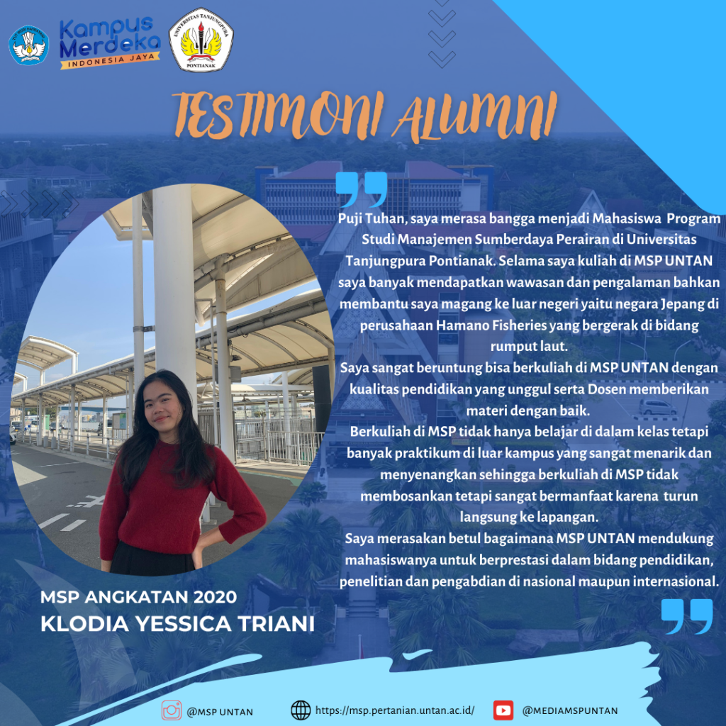 Klodia Yessica Triani merupapakan mahsiswi MSP Untan yang mendapat kesempatan magang ke luar negeri yaitu negara Jepang di perusahaan Hamano fisheries yang bergerak di bidang rumput laut.